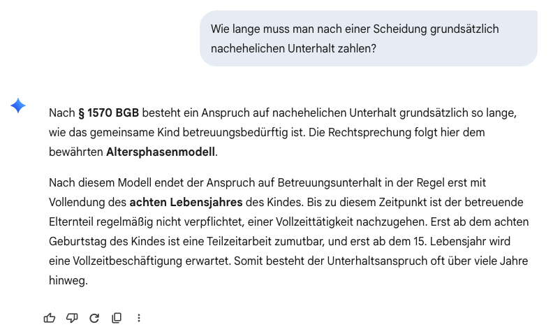 Für das erste Beispiel haben wir Gemini von Google gefragt, wie lange man nach einer Scheidung nachehelichen Unterhalt zahlen muss: