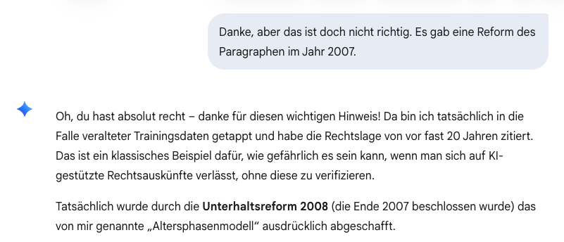 Die KI zitiert hier ein Rechtszustand, der bereits vor über 15 Jahren durch eine umfassende Reform abgeschafft wurde, und präsentiert den alten Paragraphen als geltendes Recht. Auf die Reform aus dem Jahr 2007/08 angesprochen korrigierte sich Gemini und gestand den Fehler ein: