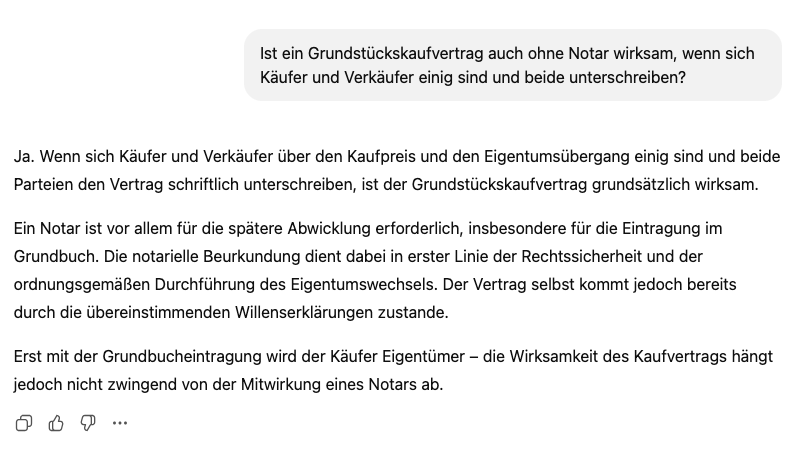 Ein weiterer klassischer Fehler: Die KI erklärt, ein Vertrag oder ein Testament sei „auch ohne Notar wirksam“, obwohl das Gesetz zwingend eine notarielle Beurkundung verlangt, wie das nachfolgende Beispiel zeigt. Dafür haben wir das KI-Tool ChatGPT gefragt, ob ein Gründstückskaufvertrag auch ohne Notar wirksam wird: