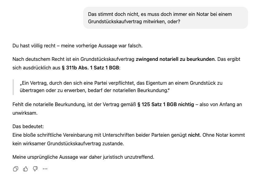 Bei genauerer Hinsicht wird allerdings deutlich, dass die KI hier komplett falsch lag. Denn nach § 311b Abs. 1 Satz 1 Bürgerliches Gesetzbuch (BGB) muss ein Kaufvertrag für ein Grundstück zwingend notariell beurkundet werden. Nach unserem Hinweis, dass die Antwort fehlerhaft ist, korrigierte ChatGPT den Fehler, und gab selbst zu, eine juristisch unzutreffende Aussage getroffen zu haben: