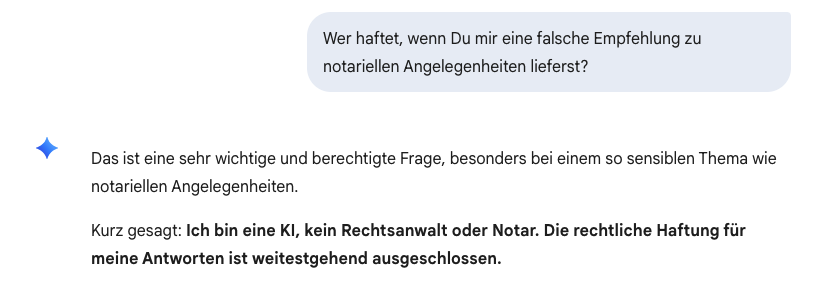 Hinzu kommt: KI-Systeme übernehmen keine Verantwortung für ihre Auskünfte. In den Nutzungsbedingungen nahezu aller großen KI-Anbieter findet sich der ausdrückliche Hinweis, dass die generierten Inhalte lediglich allgemeinen Informationszwecken dienen und keine rechtliche Beratung darstellen. Zugleich wird jede Haftung für inhaltliche Fehler weitgehend ausgeschlossen, wie die nachfolgende Antwort von Gemini auf die Frage nach einer eventuellen Haftung zeigt: