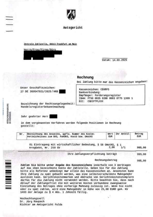 - Rechtsgrundlagen: Die genannten Gesetzes- und Gebührenverweise (u.a. GNotKG) sind entweder unzutreffend oder aus dem Zusammenhang gerissen. Die geforderte Betragshöhe ist für Handelsregisterangelegenheiten vollkommen untypisch.